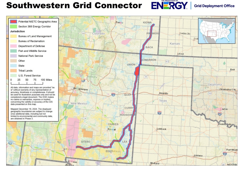 The US Department of Energy (DOE) has designated a major stretch across Eastern New Mexico to be in a potential National Interest Electric Transmission Corridor (NIETC) (see the NIETC Phase 3 Map above). The initial corridor ranges in width from three-fifteen miles wide.