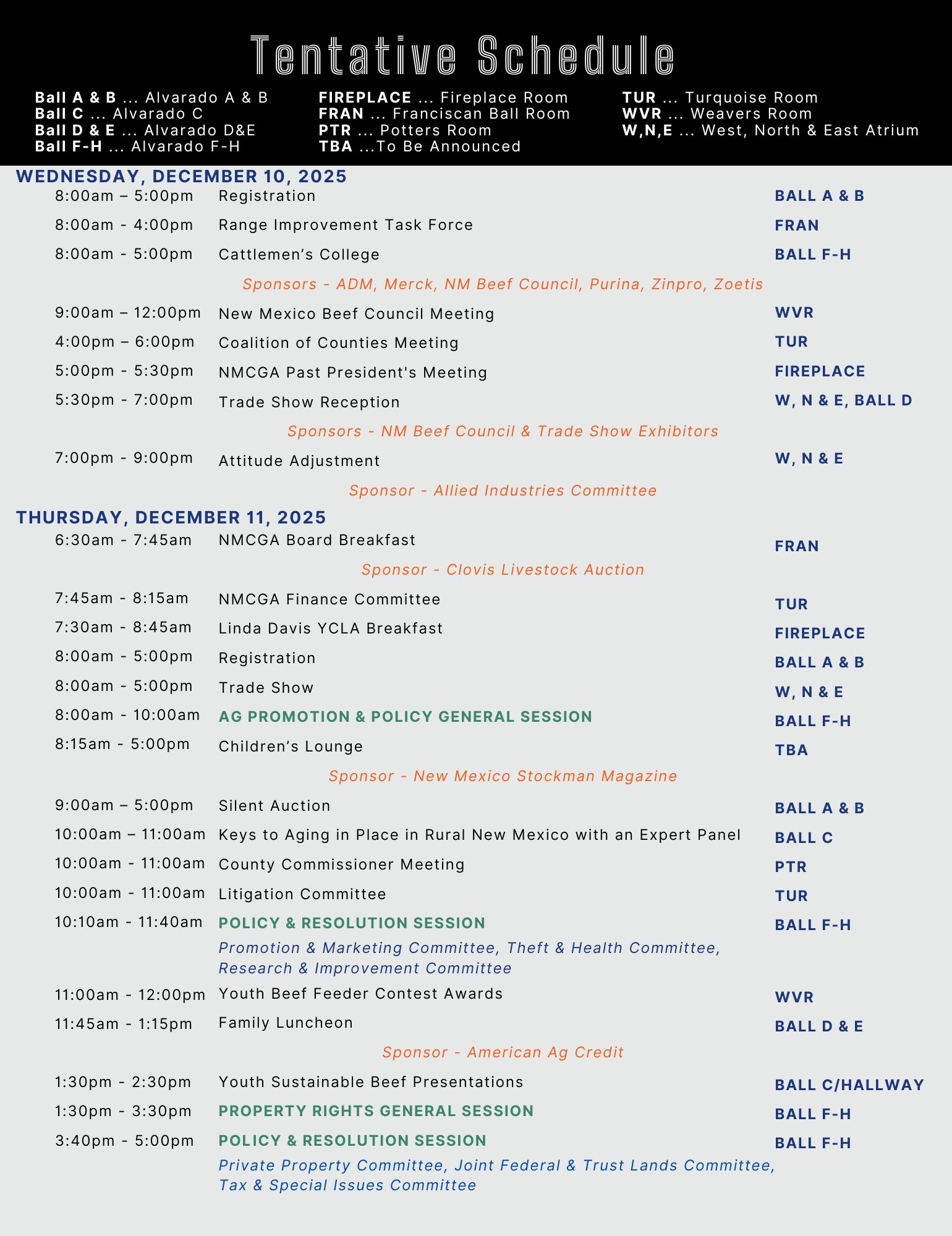 | Trade Show Reception New Mexico Beef Council Cattlemen's College ADM Merck Animal HealthNM Beef Council Purina ZoetisZinpro Legacy Awards DinnerBeaverhead Ranch Group Family LuncheonAmerican AgCredit Stockmen's Award Luncheon Animal Health InternationalDexter Livestock Commission Cattleman of the Year Award American AgCreditCoBank Cowboss Waypath Employee Benefits Allied Industry Mentor Program Agri-PlanAgTrust Farm CreditAmerican AgCreditAnimal Health InternationalRanch-Bot NMCGA Board of Directors Breakfast