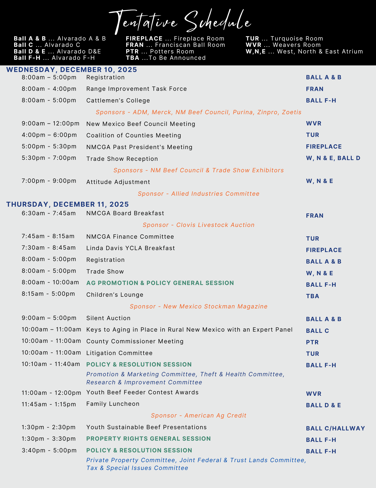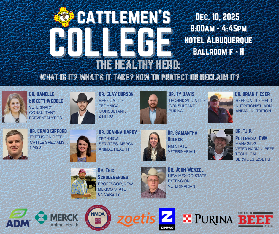 | Trade Show Reception New Mexico Beef Council Cattlemen's College Merck Animal HealthADM Purina ZoetisZinpro Legacy Award DinnerBeaverhead Ranch Group Family LuncheonAmerican AgCredit Stockmen's Award Luncheon Animal Health InternationalDexter Livestock Commission Cattleman of the Year Award American AgCredit Cowboss Waypath Employee Benefits Allied Industry Mentor Program Agri-PlanAgTrust Farm CreditAmerican AgCreditAnimal Health International NMCGA Board of Directors Breakfast